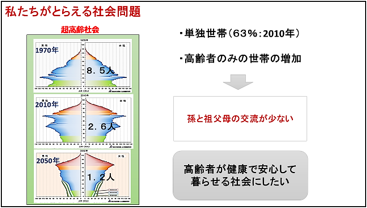 私たちは、高齢者が孫と楽しめ、機能回復ができる電子ゲーム機器を開発している。理由は、現在が、図1に示すように超高齢社会であるからである。1970年には、8.5人で1人の高齢者を支えていた。2010年には2.6人、2050年には1.2人になると予測されている。さらに、単独世帯化が進み、高齢者のみの世帯が増加すると、孫と祖父母の交流が少なくなると考えられる。そこで私たちは、高齢者が元気に生活できる環境を提供する電子ゲームを開発することにした。