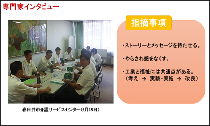 平成29年6月15日に、介護サービスセンターの施設長様、職員の方に、高齢者にゲームを使ってもらう上での注意事項などをインタビューした。図11にその様子を示す。指摘事項として、ゲームのストーリーや、メッセージを明確にしないと理解が難しいことや、やらされた感を持たせないように楽しい雰囲気を作ることがあった。また、工業と福祉には共通点があるという指摘もあった。これは、工業で製品を開発する際には、試作品を作り、評価して改良をおこなうが、福祉も同じで、考えた施策を実施し、評価して改善していく点である。インタビュー後学校に戻り、グループで対応を協議した。本電子ゲーム機器のメッセージを分かりやすくするために、笑いのあるストーリー「劇」を交えた実演を行うことにした。