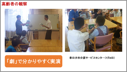平成29年7月6日に、再度、介護サービスセンターを訪問した。今回は、実際に高齢者に本電子ゲーム機器を使ってもらい感想をインタビューした。その様子を図12に示す。ゲームの説明では、「劇」を行なって説明し、楽しい雰囲気もできた。感想として、「まあまあ面白い」という声を頂いた。