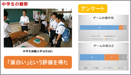 平成29年8月3日に、本校で中学生の体験入学があり、そこで本電子ゲーム機器を使ってもらった。その様子を図13に示す。中学生のアンケート結果では、ゲームの操作性に関しては、「わかりやすい」が8割以上を占めた。ゲームの面白さに関しては、「面白い」と「やや面白い」を合わせると8割を超えた。おおむね好評であった。