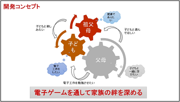 私たちの開発コンセプトを図2に示す。子供と父母と祖父母が電子ゲームを通して家族の絆を深めることである。