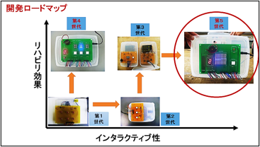 これまでの開発ロードマップは、図3にようになる。昨年度「運動」を扱った第3世代の電子ゲーム機器を開発したが、今年度は、それの改良を行ない第5世代の電子ゲームを開発した。「水準器」機能を搭載することで傾け運動の状態が分かるようにした。本報告では、新たに開発した電子ゲーム機器の製品概要および評価について述べる。