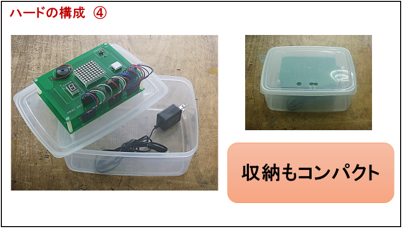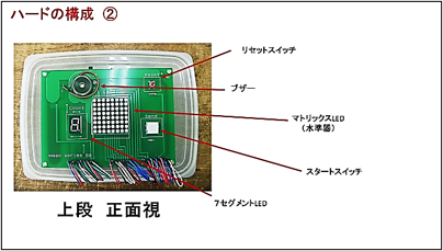 図4、図5、図6に外観図を示す。ゲーム機器は、2段の基板から構成され、上段には、図4に示すように、「水準器」のマトリックスLED、7セグメントLED、ブザー、スタートスイッチなどを配置した。下段には、図5に示すように、CPU、加速度センサ、赤外線LED、赤外線受光素子などを配置した。また、図6に示すように、ゲーム機器は、タッパーケースに収まるようにし、収納もコンパクトにした。