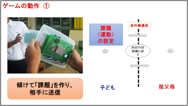 次に図8に示すように、「課題」を受信した祖父母は、「課題」の回数分だけ、電子ゲーム機器を傾ける。これを「課題」の「処理」という。「課題」が「処理」できたら、図9に示すように、祖父母は、電子ゲーム機器を傾けて、「課題」を設定し、スタートスイッチを押して、赤外線通信で「課題」を子どもに送信する。