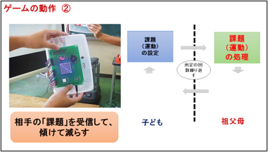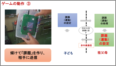 図10に示すように、「課題」を受信した子どもは、「課題」の回数分だけ、電子ゲーム機器を傾け、「課題」を処理する。この一連の動作を3回繰り返すと終了となる。この一連の「共同作業」ができたら音楽がブザーから鳴る。音楽は「カエルの歌」である。