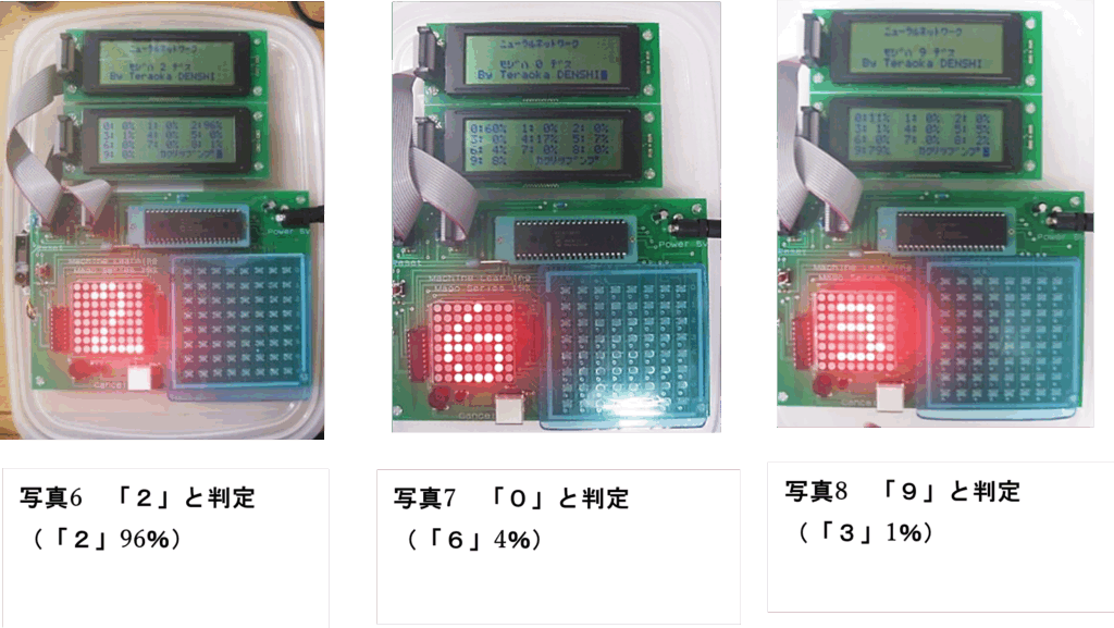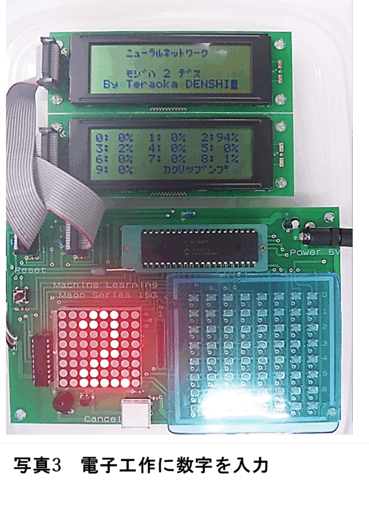 最後に、電子工作の動作とエクセルとの整合性を述べる。写真3は、電子工作に文字を入力してニューラルネットワークを計算させた様子である。これから、入力した数字を「2」と判定し、その確率分布を2が94%、3が2%、8が1%、その他は0%と計算していることがわかる。