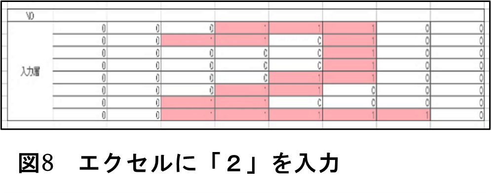 一方、エクセルの入力層に図8のように入力すると、その出力は1が0.4%、2が94.8%、3が2.5%、5が0.1%、7が0.7%、8が1.4%、9が0.1%、その他が0%となった。電子工作は、小数点以下を切り捨てているので両者は一致している。