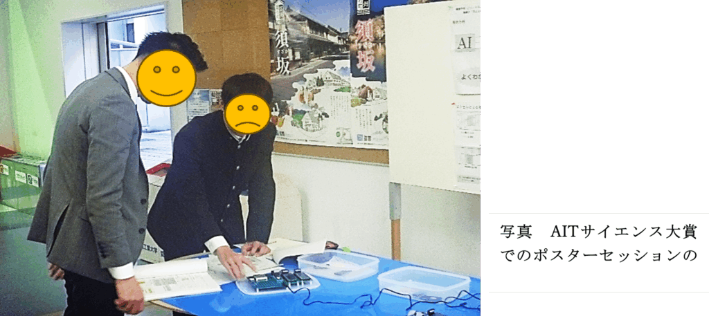 11月2日(土)、大学主催のAITサイエンス大賞の自然科学部門に参加した。スライドとともに発表し、その後ポスターセッションで大学の先生や他の参加者と交流した。そこで、大学の先生方々から、「AIはいわばブラックボックスのためよくわからない。」、「計算式中のバイアス、活性化関数などの意味が分からない。」、「実物を見るまで電子工作による見える化で何をしているのか分からなかった。」などの意見を頂いた。私自身よく分かっていない部分が多く、適切な説明をすることができなかった。しかし、研究の流れを説明し、実際に電子工作で数字認識を体験してもらうと、「おもしろい」や「わかりやすい」などの意見をもらうことができた。また、学習について、「その学習データはどう作ったのか」、「学習の仕組みはどのようなものなのか」という質問もあった。本研究はAIの機構(推論=計算の流れ)の研究であったため、「学習」そのものについては触れていなかった。そのため、質問されても私自身、十分理解できておらず、説明することができなかった。