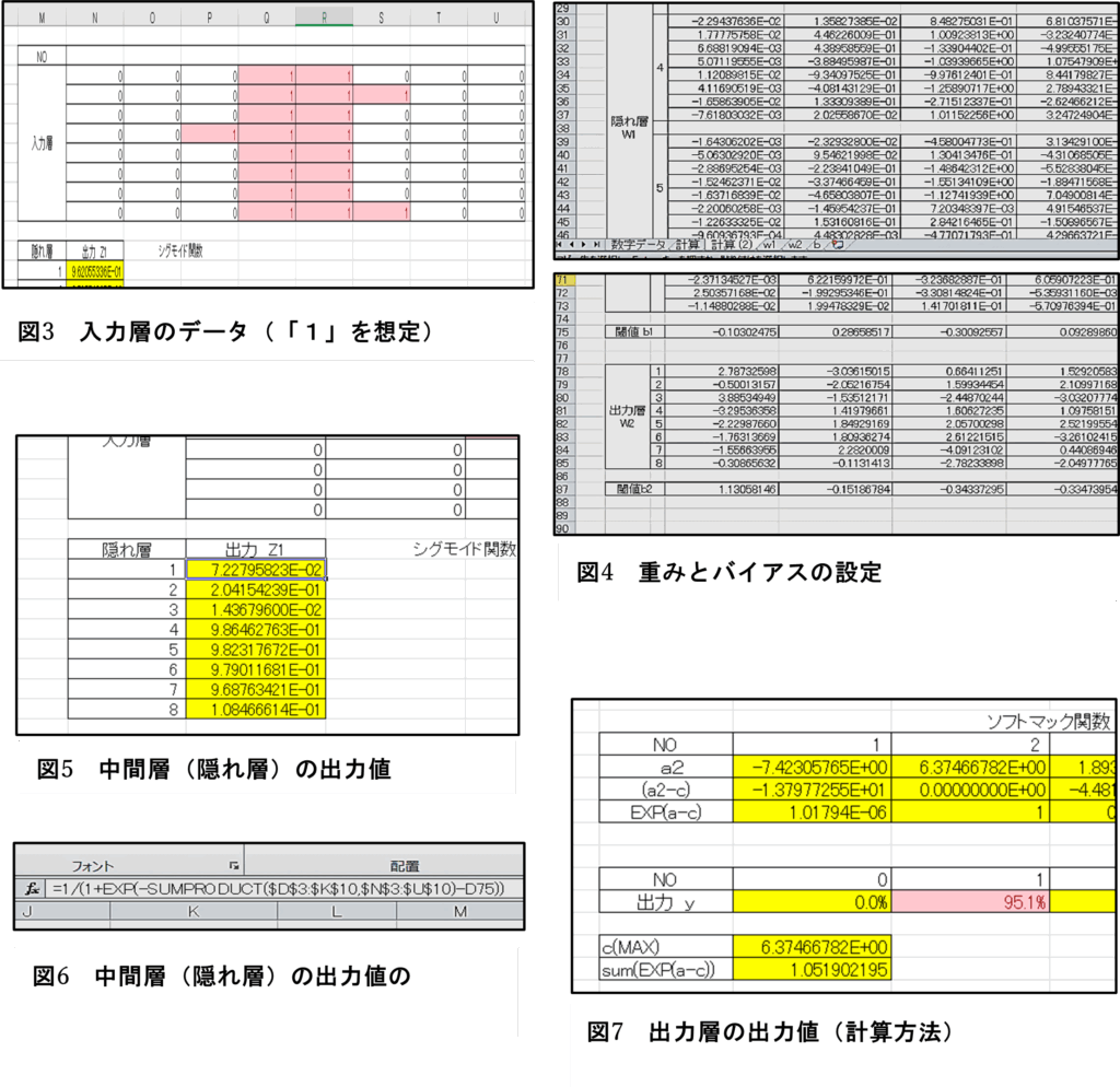 図5に中間層の出力値を示す。また、図6はそのセルの関数式(シグモイド関数)である。「$D$3:$K$10」が重みw1、「$N$3:$U$10」が入力層、「-D75」が閾値b1を示す。