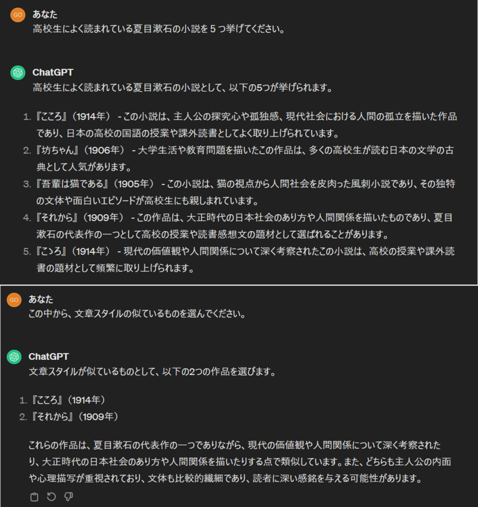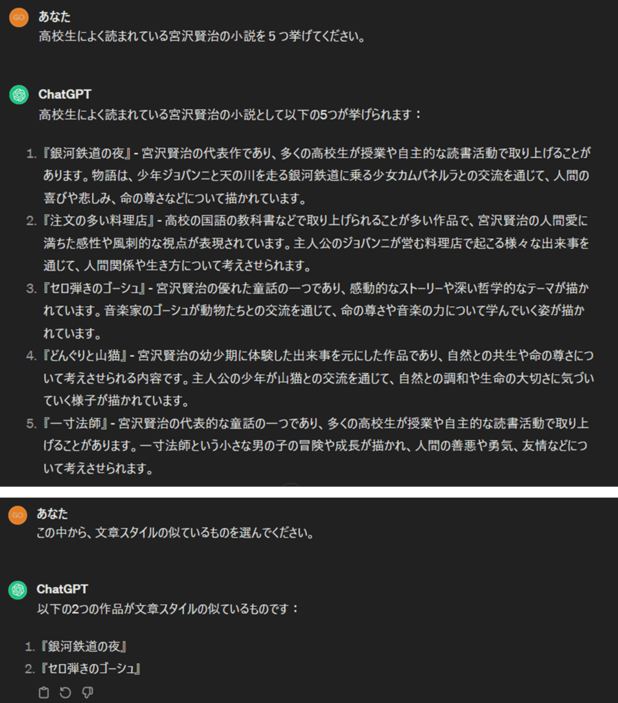 次に、どの作品を分析するかですが、同じ作家でも文章スタイルは、作品によって異なることがあります。そこで、私は、文学に詳しくないので、ChatGTP(3.5の無料版)に訊いてみました。