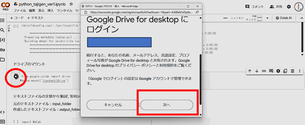 1. 次のコードセル「ドライブのマウント」のセルを押して、ドライブのファイルをアクセスできるようにしましょう。