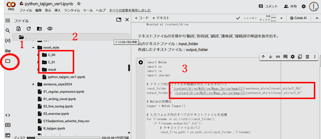 左の「1」フォルダのアイコンクリックして、左のサイドウインドウからアップロードしたフォルダを表示させ、「2」C_00(C_01も同様、後のresultも同じやり方)のフォルダを右クリックします。そして現れたプルダウンの中から「パスをコピー」をクリックします。「3」それを右のプログラムのダブルクオテーションの中に貼り付けます。