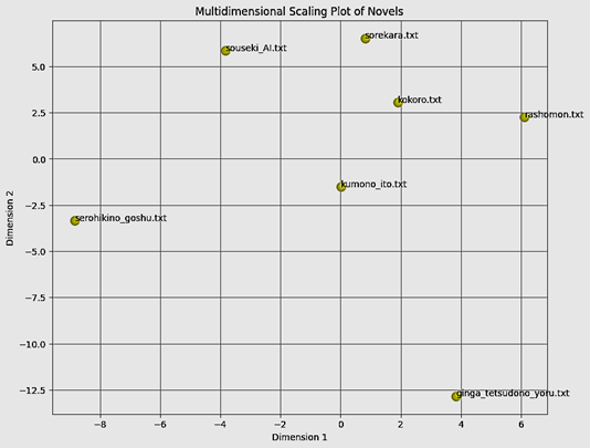 作品の原文にあたる必要がありますが(ここは重要です)、単語の出現頻度という単純な分析でも、各作品の文章スタイルを分析できるようです。 今回分析に使った多次元尺度法は、各要因(多次元)間での距離を求めるものです。この距離の違いにより類似度を知ることができます。