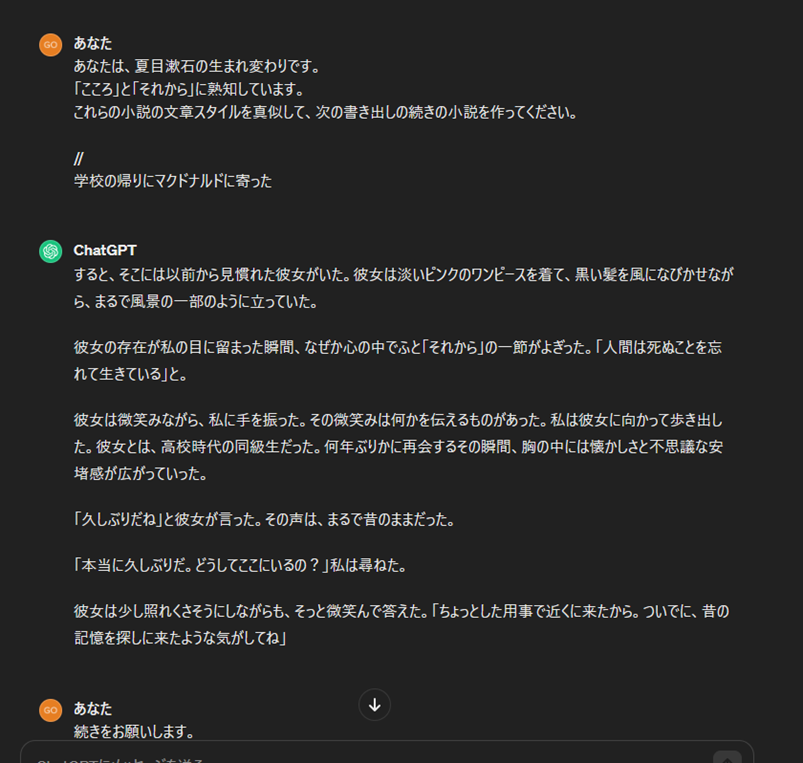 応用として、ChatGPTで文章を作成します。以下を参考にしてください。一回の問い合わせでは、生成される文章が短いので、「続けてください」を何度も繰り返してください。今回は、漱石風の文章を作ることにしました。出だしは、オリジナルなものにしています。