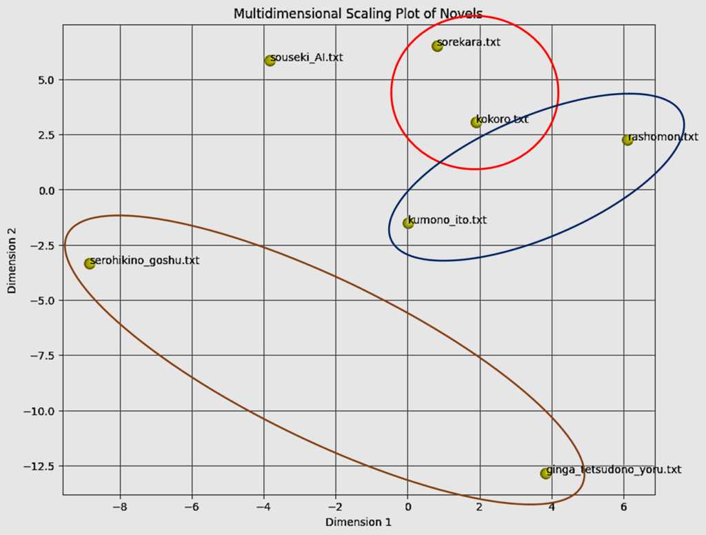多次元尺度法で2次元グラフにした結果は以下のようなものでした(再掲)。