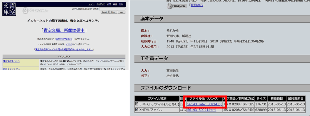 「青空文庫」のサイトから、作品(「テキストファイル」)を選びダウンロードします。