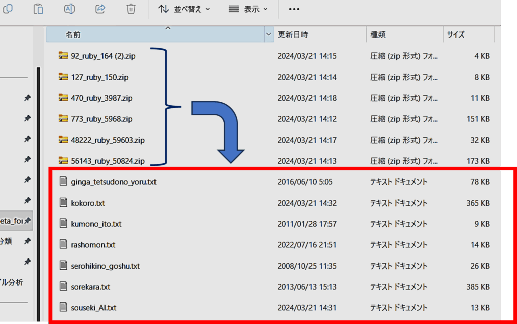 ②ダウンロードしたZIPファイルから作品のテキストファイルを取り出そう。