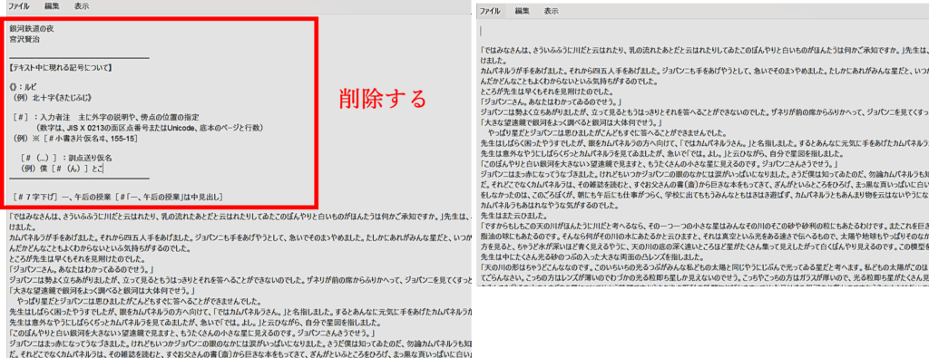 テキストファイルの文章の中で、説明部分を削除(デリート)しよう。