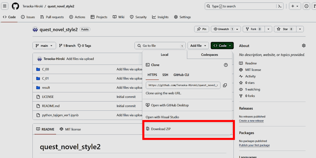 「Code」ぼボタンからプルダウン表示させて、ZIPファイルでダウンロードできます。