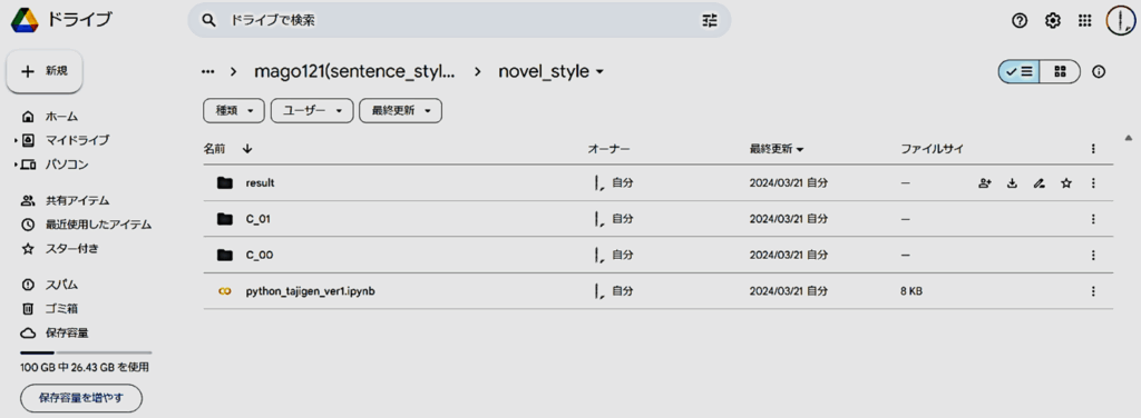 Googleのアカウントが必要です。MyDriveに自分でフォルダ(名前は自分で決めてください)を作り、そこに④でダウンロードしたファイルをアップロードします。下図のようになればOKです。
