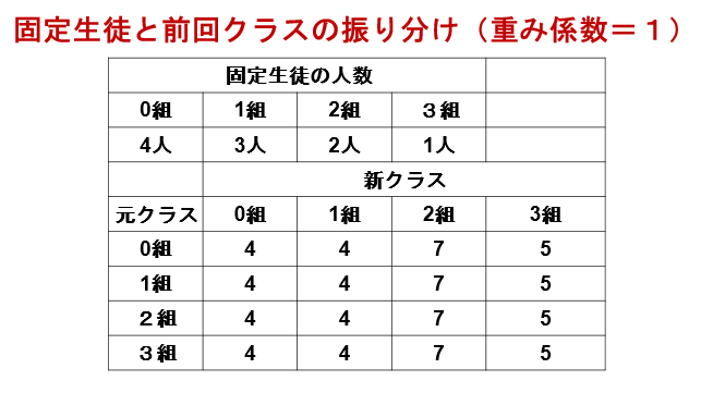 下図は、旧クラスの生徒が新クラスに移る際、できるだけ「ばらける」ように振り分けた結果の例です。ここでは、このコスト関数の重み係数を「1」と小さく設定しています。そのため、ゆるく分けられています。ちなにみ、固定生徒は、各クラスに「固定」されて不動です。