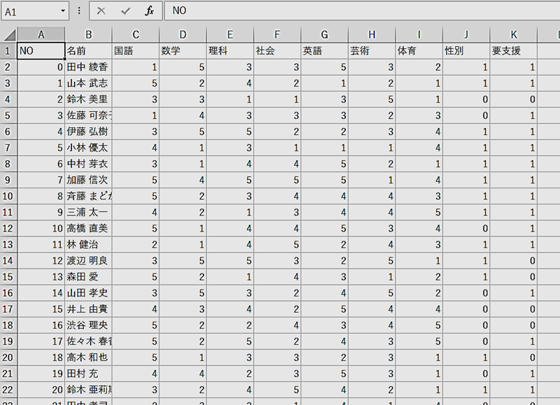 例えば、以図のような名簿(架空の名簿です)があったとします。各生徒の国語、数学、理科・・・の成績(評定)、性別(例えば、男:0、女:1)、要支援(例えば、支援が必要:1、不必要:0)です。ここで、生徒を各クラス(例えば4クラス)に、成績、性別、要支援ができるだけ均等になるように振り分けたいとします。要因が2種類程度であれば、エクセル等でソートすればできますが、要因の数が増え、また生徒数も多くなると、その組み合わせ数は膨大となり簡単に求めることができません。このような状況は一般に、「組合せ爆発」と呼ばれています。