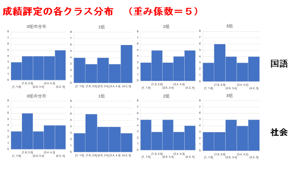 以下は、国語と社会の成績の振り分けの結果です。各クラスのヒストグラムの棒は、左から評定「1」、「2」・・・「5」の人数です。ここでは、このコスト関数の重み係数を「5」と大きく設定しています。詳細な評価分析が必要ですが、ほぼ均一に割り振られています。