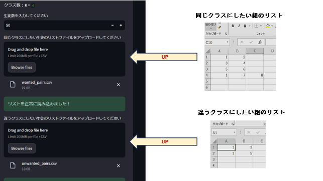 次に、同じクラスにしたい生徒の組と、違うクラスにしたい生徒の組のリストをアップロードします。下図の例では、同じクラスにしたい生徒の組は、(1番と2番の生徒)、(3番と4番の生徒)、(5番と6番の生徒)および(1番、7番、8番の生徒)です。違う生徒の組は、(1番と3番の生徒)および(1番と5番の生徒)です。