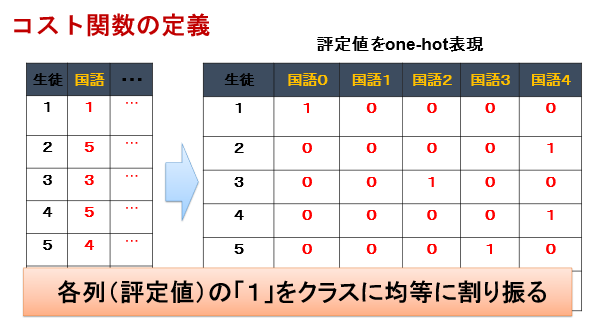 そこで、各教科のそれぞれの評定値が、各クラス同じ人数になるようにすることを考えました。具体的には、以図のように、評定値をone-hot変換します。例えば、3番の生徒の国語の成績は「3」ですが、「国語2」の成績を「1」にし、「国語0」、「国語1」、「国語3」、「国語4」の成績を「0」にします。このように、この新しく作った各成績の「1」の数が各クラスになるべく等しくなるように割り振ります。こうすることで、各クラス間の成績分布の偏りを防ぐことができます。