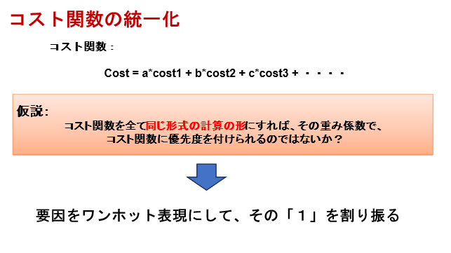 しかしながら、上記のように、全ての各要因について、その「1」の数を均一に割り振るようにコスト関数の計算方法を同じにしているので、単純に重み係数によって優先順位を付けることが可能になったのです。