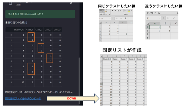 そうすると、固定生徒のリストが生成され、ダウンロードできます。下図の例では、(1番、2番、7番、8番の生徒)が1組に固定されています。2組、3組も同様です。