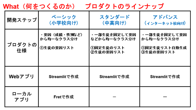 私たちのチームでは、以下のようなタイプ別に3つの「クラス分け最適化アプリ」を制作しました。