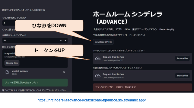 次に、アプリの右側のメインの部分に移り、まず、量子アニーリングマシンを動かすためのトークンをアップロードします。トークンというのは、パスワードのことです。これは、FIXSTARSのサイトから作ることができます。また、この後、生徒名簿をアップロードしていきますが、そのひな形もダウンロードできます。